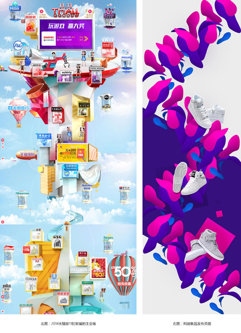 / 電商領域的單頁設計,更像是對平面單頁在使用環境上的升級,它不僅擁有平面設計中的所有設計規律,更有著網站設計的很多特點,比如:可以利用新的視差滾動和H5的技術,來使頁面與人的交互更密切,也使得用戶在瀏覽頁面時,更像是在閱讀一個故事。