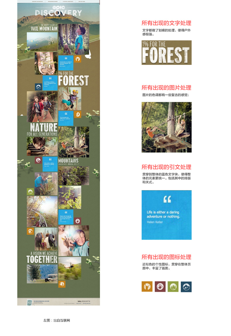 02.右圖是一個國外戶外專題單頁的設計,整體以傾斜感的折線為主元素,具有動感、運動的印象。同時,結合非常有動勢的人物圖片使得整體頁面的動感時足。